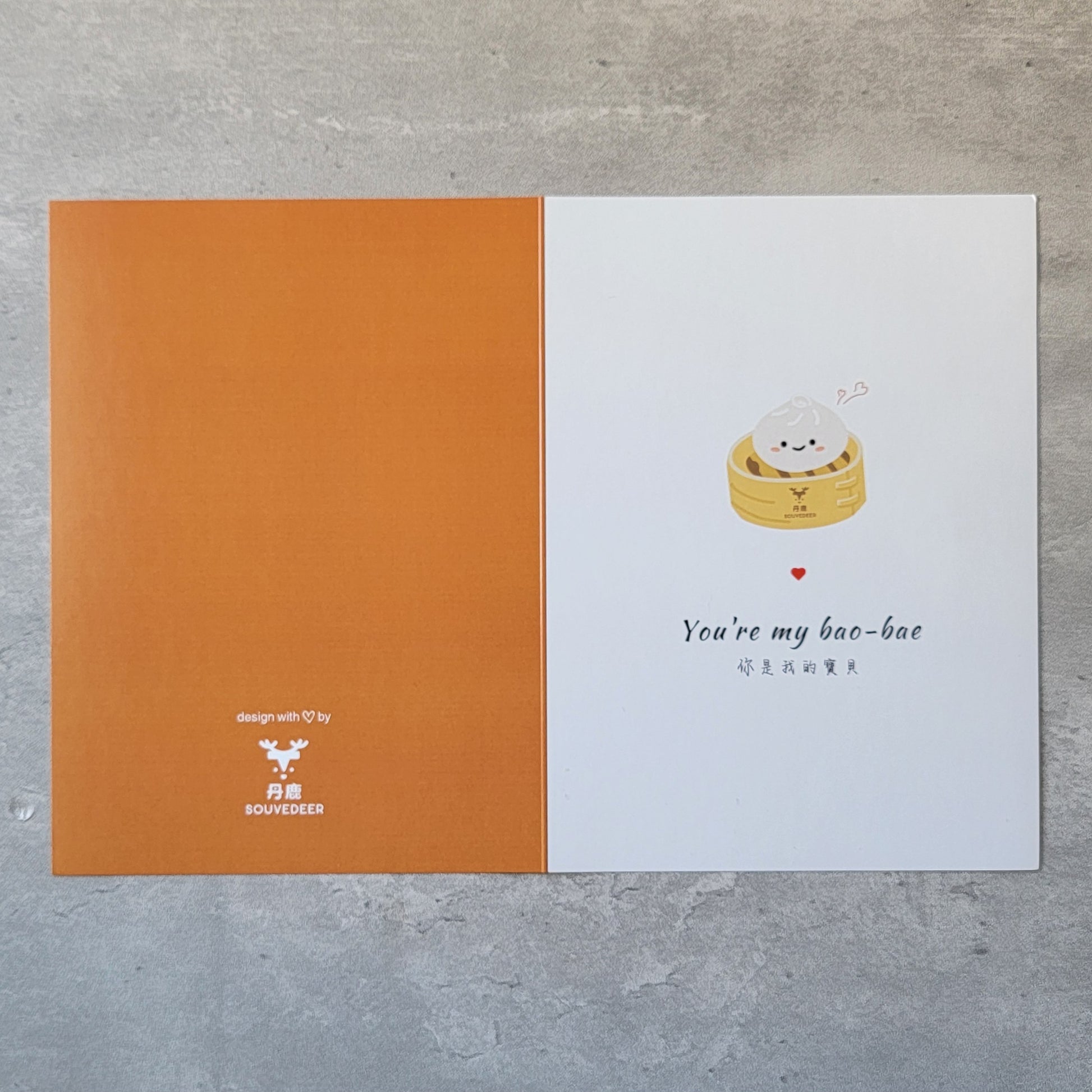 丹鹿SouveDeerによるデザイン。 「You're My Bao Bae」グリーティング カードであなたの愛を伝えましょう。遊び心があり、文化的なインスピレーションを受けたカードで、相手があなたの宝物であることを示します。