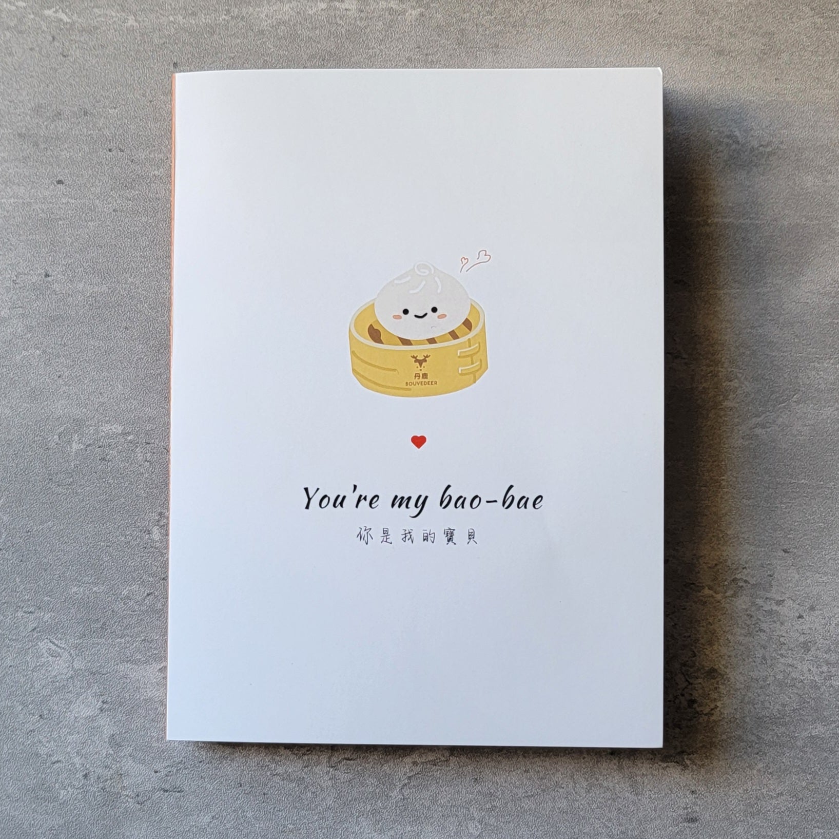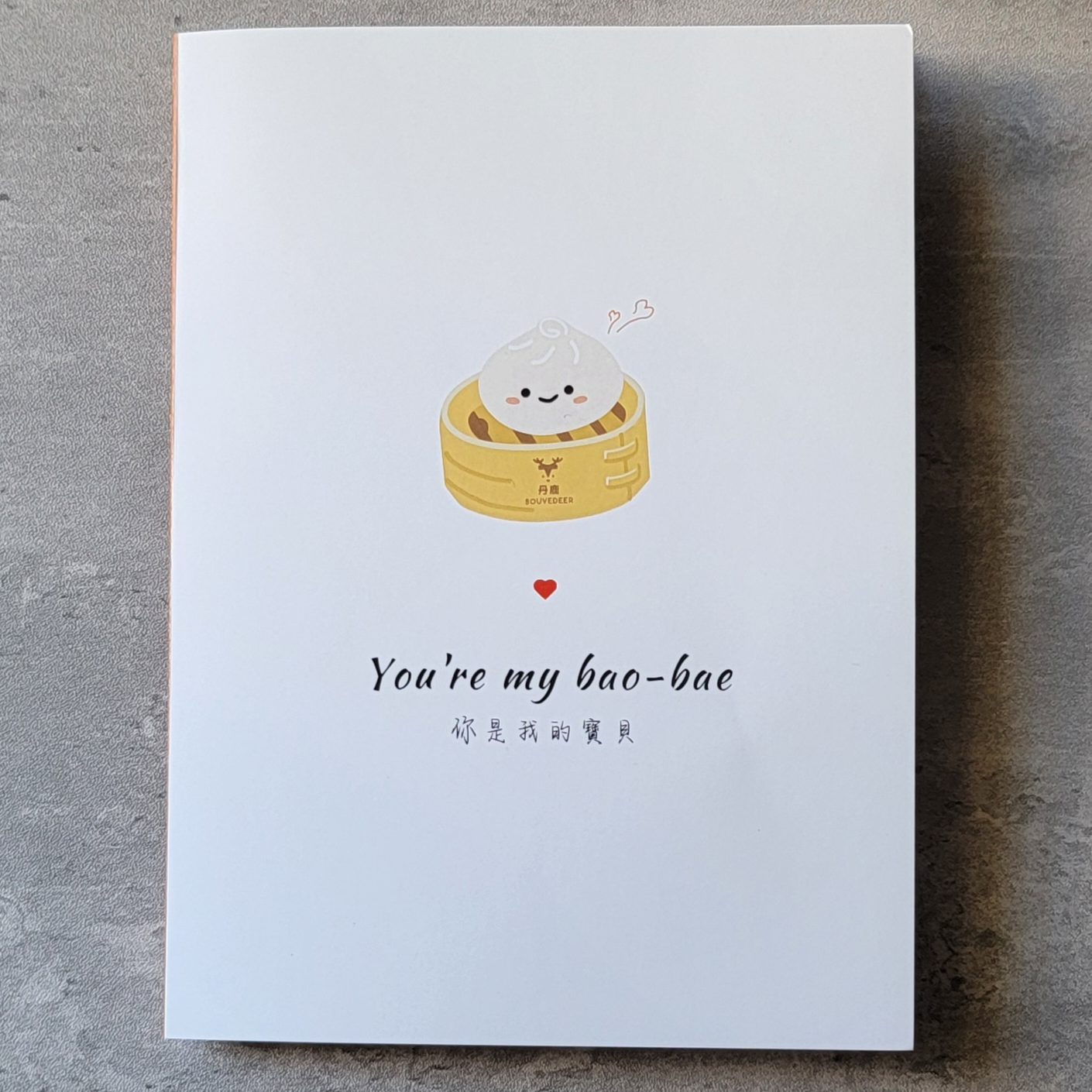 竹の蒸し器に入った小籠包(スープ入りの餃子)の愛らしいイラストが描かれたこのカードは、グルメな方、餃子好きの方、そして台湾文化ファンの方にぴったりです。中国語の「寶貝」(bao bèi、「最愛の人」または「恋人」の意味)を巧みに使った言葉遊びで、記念日、バレンタインデー、誕生日など、どんなお祝いにもぴったりです。